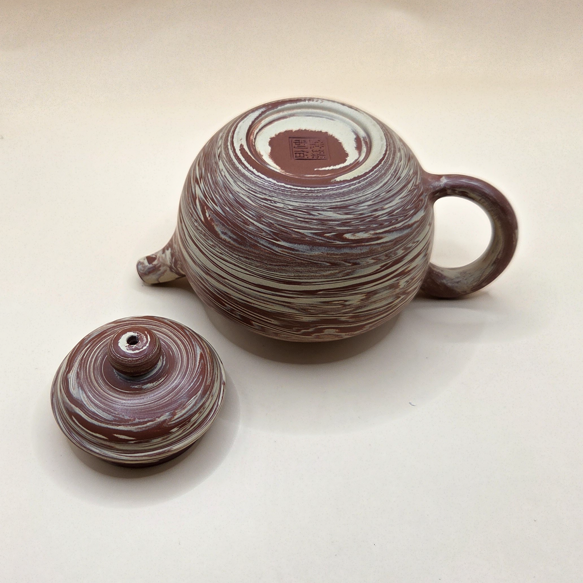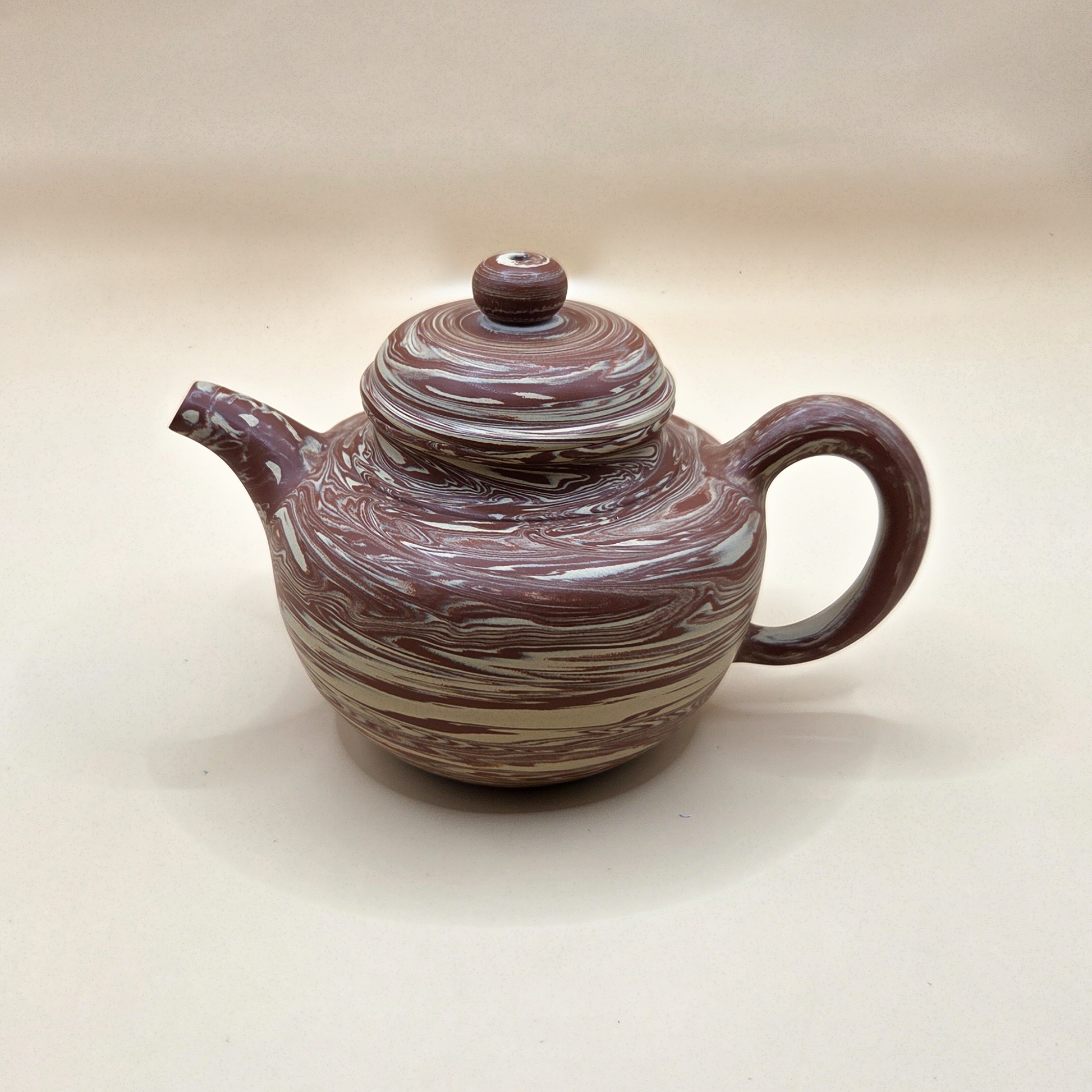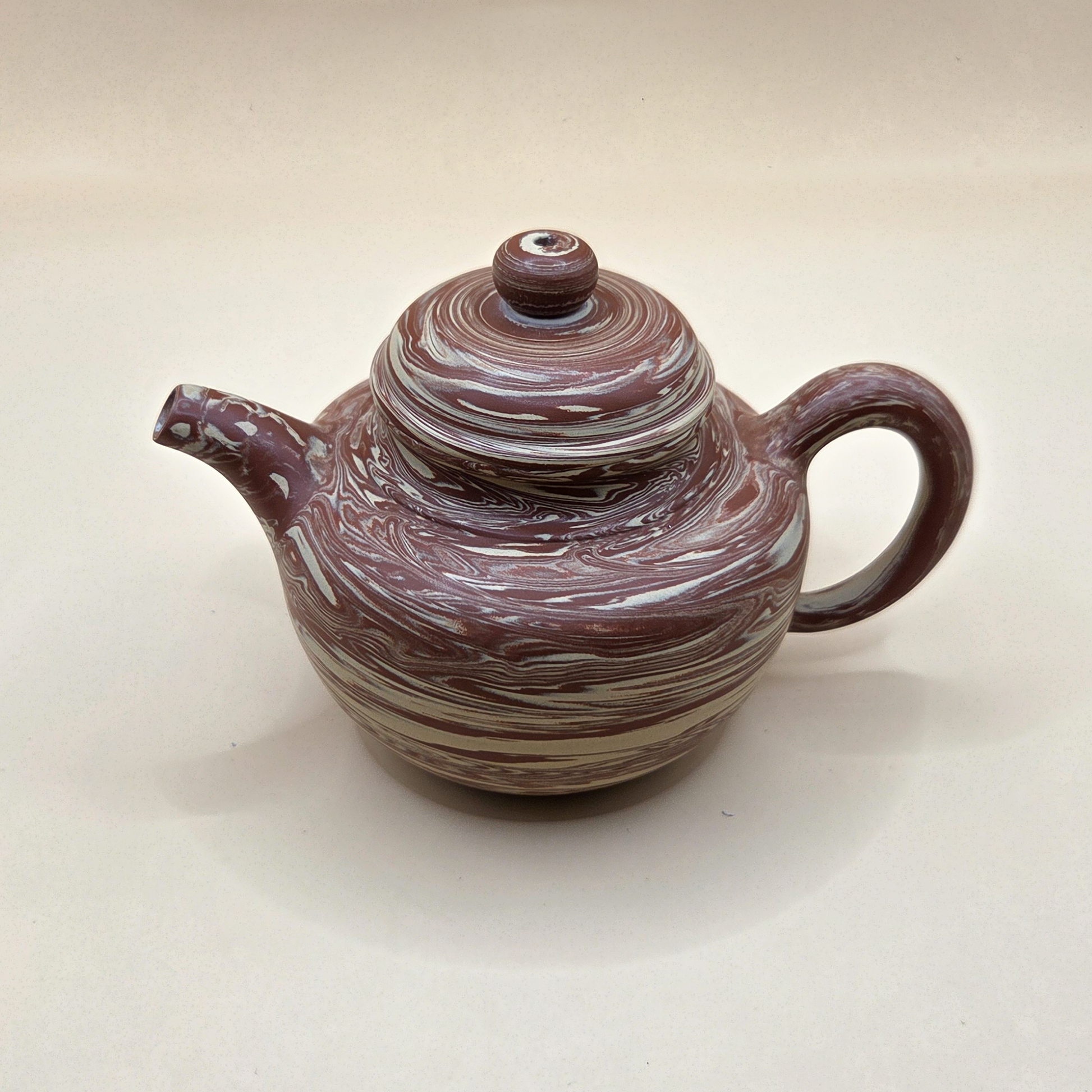 Чайник ручной работы из многоцветной глины Цзяншуй. Природные слои красной, белой и серой глины образуют узор, похожий на волны или мраморные прожилки. Каждый чайник уникален — рисунок рождается естественно при смешении глин и не повторяется.